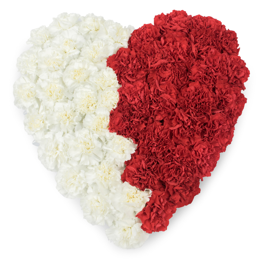 Express heartfelt sentiment with our sophisticated heart-shaped bouquet of mixed carnations by Handy Flowers. Elegantly crafted, this arrangement pairs the immaculate charm of white carnations with the vibrant allure of red carnations to create a meaningful display that captivates.